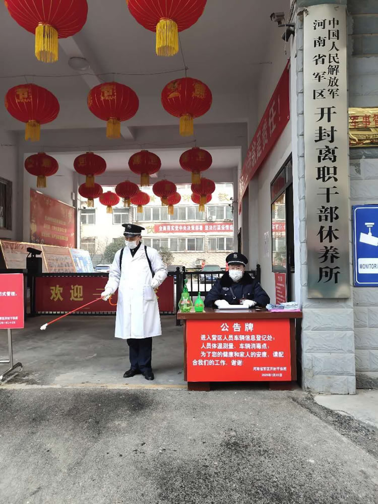 5、河南省軍區(qū)開封離職干部休養(yǎng)所崗點(diǎn)的保安員盡職盡責(zé)。接到防疫任務(wù)后,保安員實(shí)行全封閉管理,隊(duì)員24小時(shí)堅(jiān)守崗位,嚴(yán)格控制進(jìn)出人員,承擔(dān)著出入人員體溫測(cè)量、車輛消毒、軍干所場(chǎng)所的消毒任務(wù),并做好登記工作。