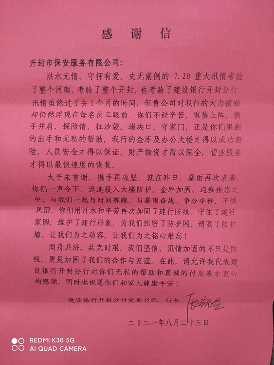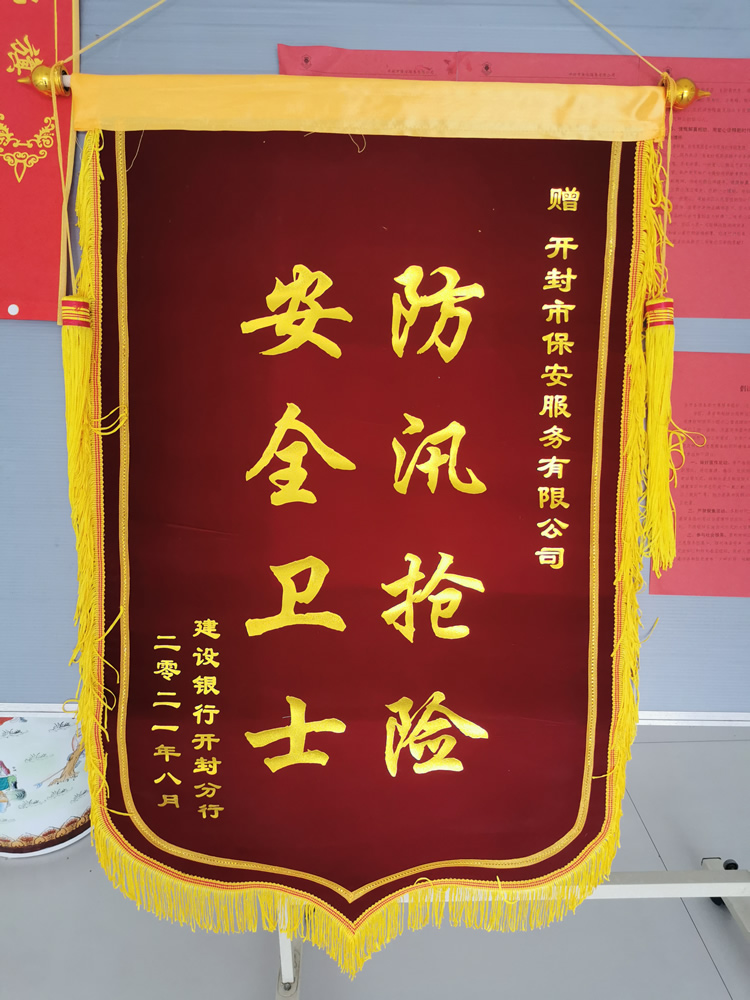 8月24日,中國建設(shè)銀行開封分行李行長等一行4人,向公司贈送寫有“防汛搶險安全衛(wèi)士”的錦旗,以感謝公司派駐該銀行的保安隊員在近期重大汛情考驗中防汛搶險的突出表現(xiàn)。