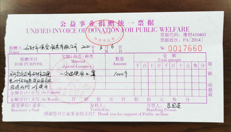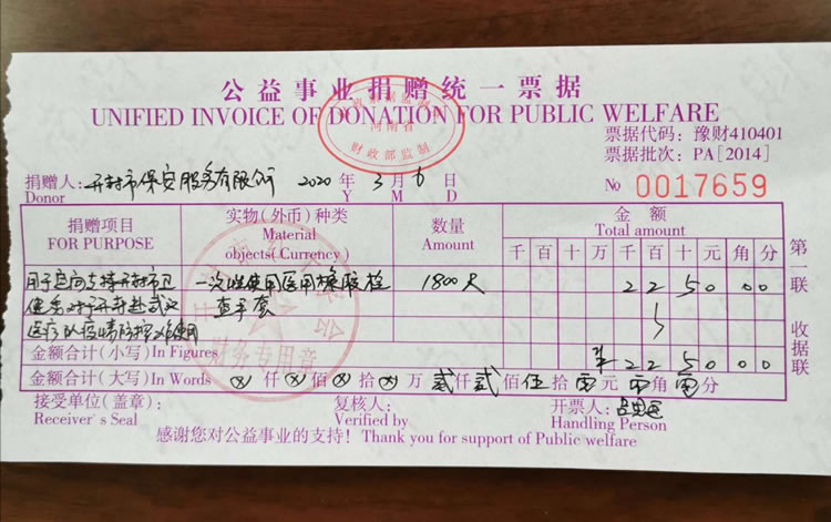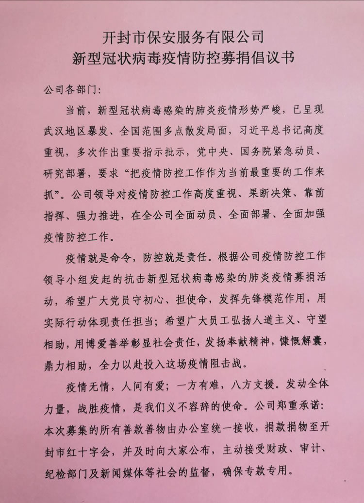 2020年3月2日,公司發(fā)起了新型冠狀病毒疫情防控募捐倡議書(shū),倡議全體人員捐款、捐物支援疫情嚴(yán)重地區(qū),助力武漢抗擊疫情。全體員工積極響應(yīng),紛紛捐款,僅一天時(shí)間就籌集善款32737元。公司孫國(guó)杰總經(jīng)理在抗疫物資緊缺的情況下,多方聯(lián)系外地的廠家,購(gòu)買防疫物資,此次公司向開(kāi)封市紅十字會(huì)捐贈(zèng)抗疫物品一批,價(jià)值18033元:醫(yī)用一次性口罩1000個(gè)、護(hù)目鏡190個(gè)、防護(hù)服20套、醫(yī)用一次性手套1800只、電子體溫計(jì)1個(gè)。并及時(shí)通過(guò)河南省保安協(xié)會(huì)聯(lián)系疫情嚴(yán)重地區(qū)(湖北省保安協(xié)會(huì)),向?yàn)?zāi)區(qū)保安員表示慰問(wèn)。