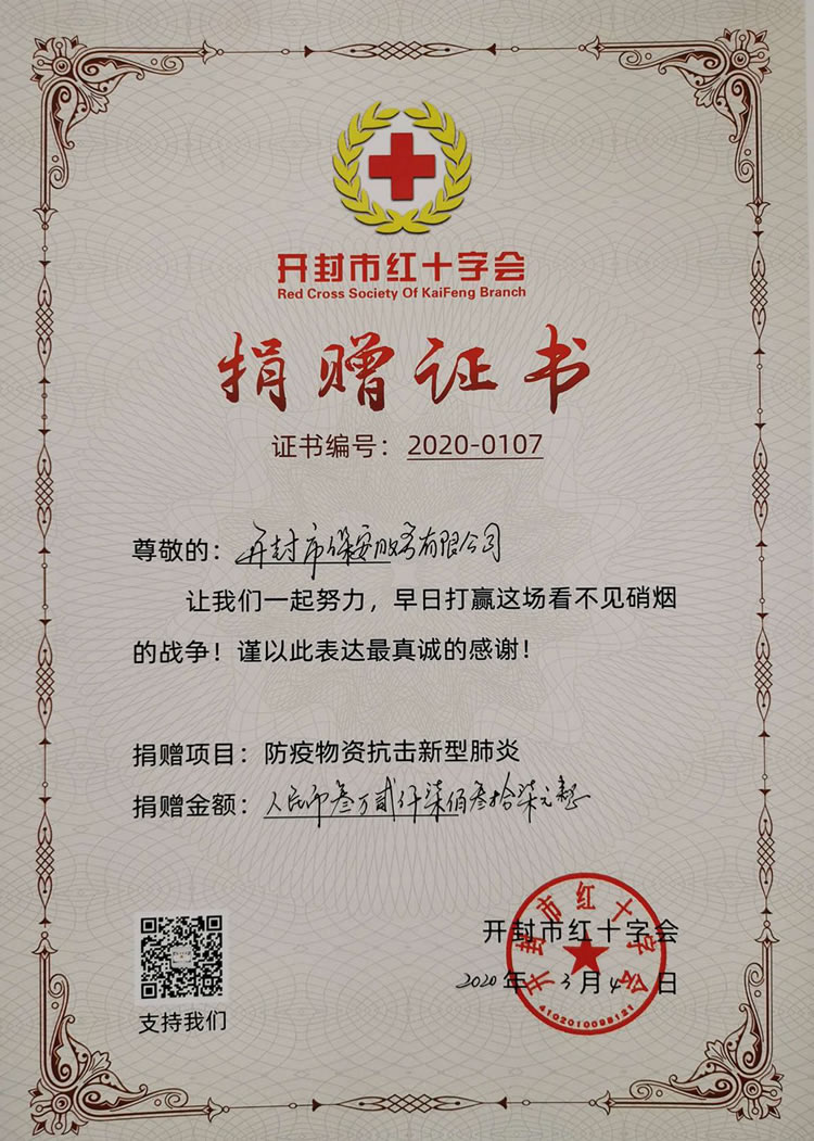 2020年3月4日,公司由副總經(jīng)理李梅帶領(lǐng)辦公室人員把所捐款項(xiàng)和物資交到了開(kāi)封市紅十字會(huì),用于定向支持開(kāi)封市衛(wèi)生健康委員會(huì)對(duì)于開(kāi)封赴武漢醫(yī)療隊(duì)疫情防控工作使用。