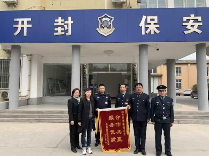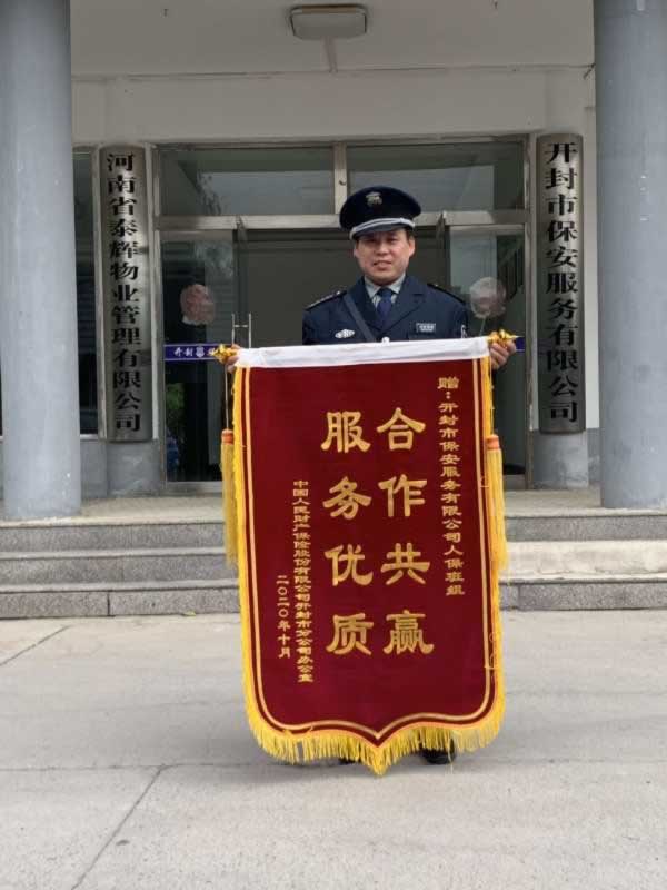 2020年10月26日上午,人保財險公司辦公室一行3人為開封市保安服務有限公司送來一面上書“合作共贏,**服務”的錦旗,對公司保安一部駐人保財險班組的工作給予了充分的肯定,對班組隊員積極認真的工作作風,熱情周到的服務提出了表揚。