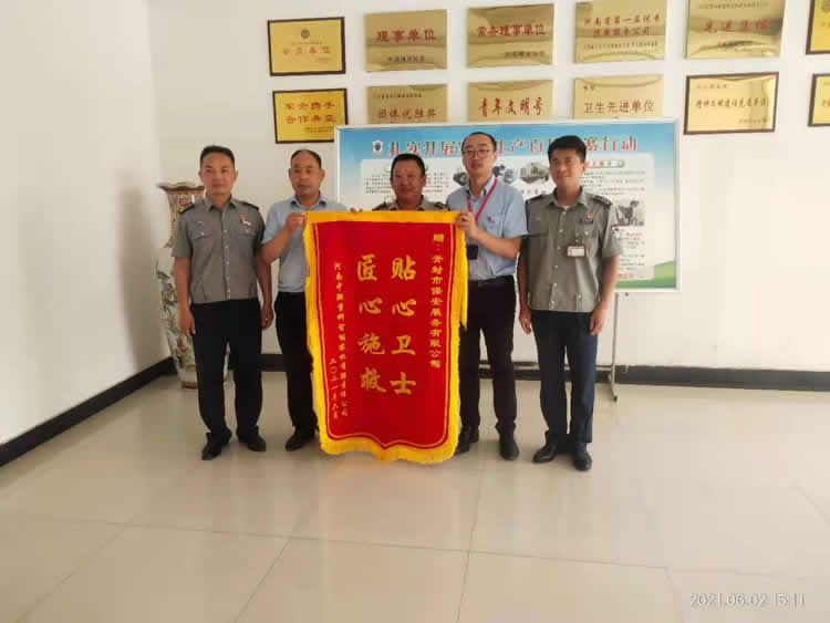 6月2日下午,保安二部服務(wù)單位瑞創(chuàng)公司韓海波主任一行人來我公司,向公司贈(zèng)送“貼心衛(wèi)士,匠心施救”錦旗,對(duì)二部翟玉林中隊(duì)保安員王寶慶危急時(shí)刻救治瑞創(chuàng)職工事,表示高度贊揚(yáng)和誠摯感謝。